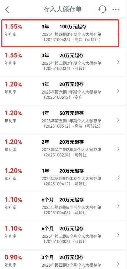 12月3日,据工商银行APP显示,该行正在发售的2025年第四期3年期个人大额存单,起步门槛标注为“100万元起存”,而年利率仅为1.55%。而最新的工行三年期定存产品的年利率,标注为“年利率最高可至1.55%”,而定存的起步门槛仅为50元。