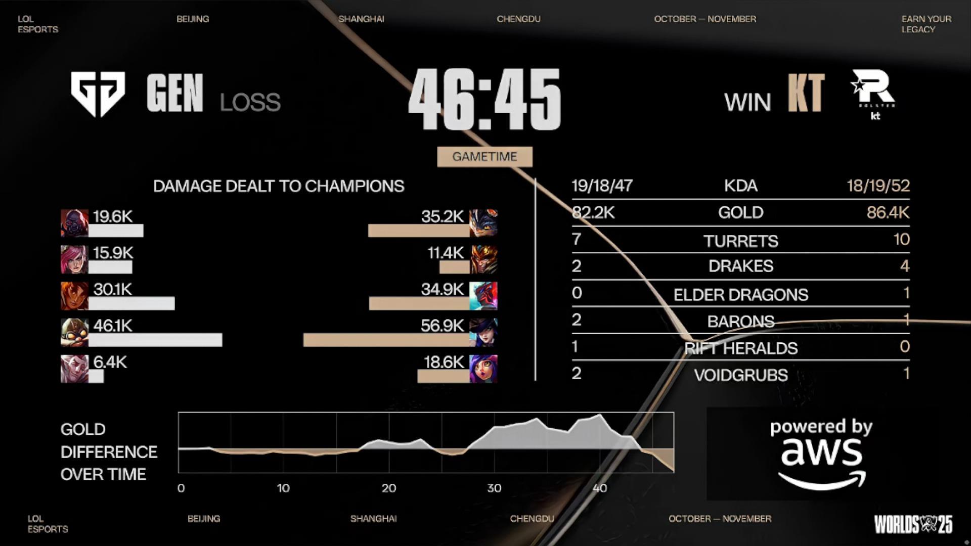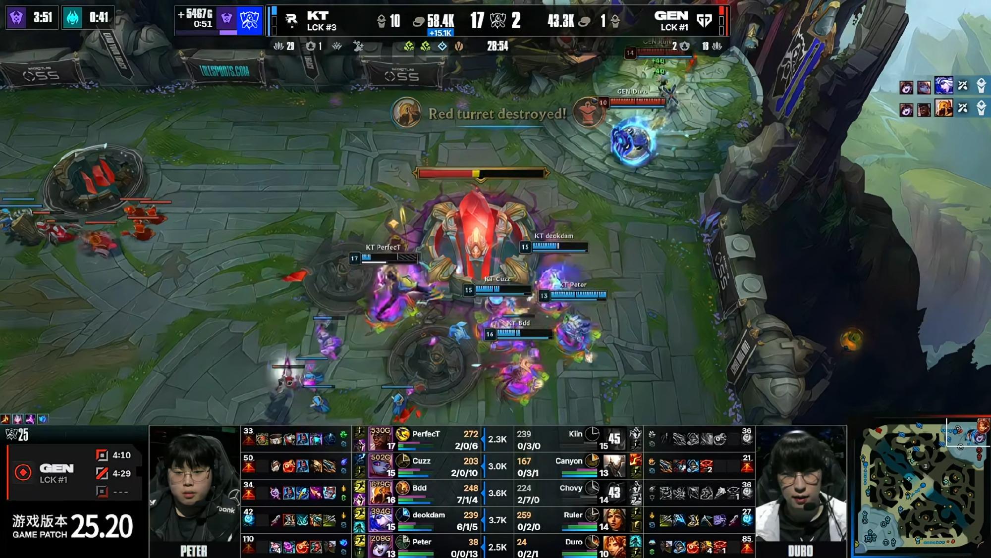 中期GEN上路打残KT多人后,拿下厄塔汗。27分钟野区混战,PerfecT兰博大招失误,GEN双C完美输出嘉理证券,打出1换4后,拿下第一条大龙。后期33分钟cuzz皇子被抓死,canyon蔚上头冲到高地,但是BDD永恩完美反打,双方打出4换4,不过cuzz皇子率先复活,KT拿下土龙魂。37分钟双方争夺大龙,KT赶走GEN后接手大龙,但是perfecT兰博站位失误被秒,deokdam女警被Kiin赛恩堵在龙坑中,GEN打出2换4后,拿下第二条大龙。但是GEN推进时,KT中辅开团击杀chovy岩雀,41分钟KT光速拿下远古龙,43分钟KT无伤拿下第三条大龙。最终46分钟KT推上高地直接拿下第一局的胜利。首局伤害最高的是Deokdam女警。
