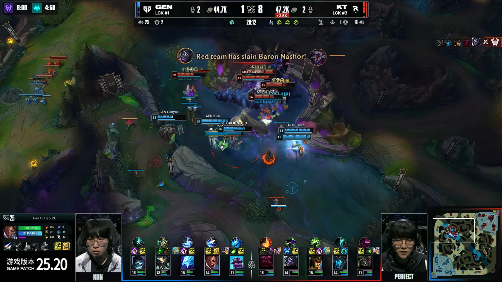 第四局GEN上单牧魂人,打野蝎子,中单冰鸟,下路卢锡安加布隆;KT上单奥恩,打野蒙多,中单蛇女,下路滑板鞋加烈娜塔。对线期小龙团,GEN拿下小龙,KT则是打出0换2。随后峡谷先锋团战,cuzz拿下峡谷先锋,KT又打出0换3,前期KT经济领先1K。